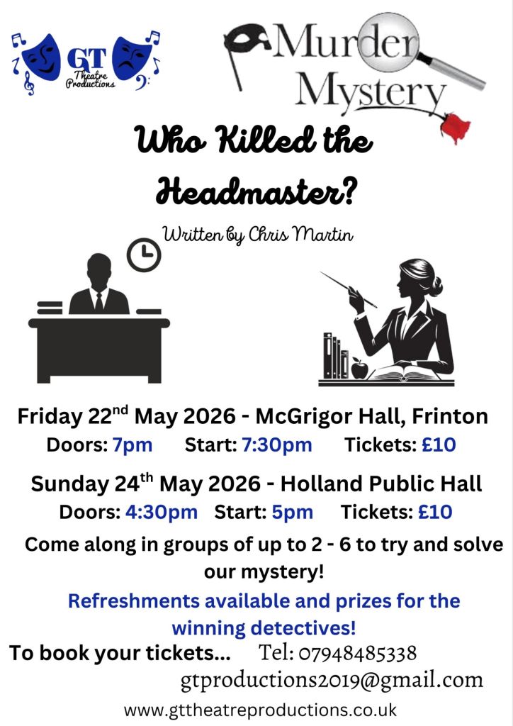Who Killed the Headmaster? Friday 22nd & Sunday 24th May 2026 A murder mystery play where you, the audience are the detectives. A play in 3 short acts where you try to work out who our Murderer is and to find out who really did kill the Headmaster.